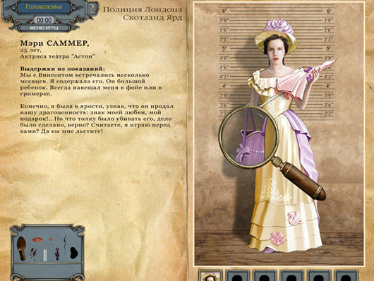 Удивительная по своей красоте детективная игра жанра "я ищу". В компании легендарных литературных героев, Шерлока Холмса и доктора Ватсона, вам предстоит расследовать головоломное убийство. Минимум улик, максимум подозреваемых, отсутствие зацепок... Что делать? Знаменитому сыщику не привыкать к таким проблемам! Вместе с Холмсом вы распутаете упругий клубок причинно-следственных связей и найдете таинственного убийцу!