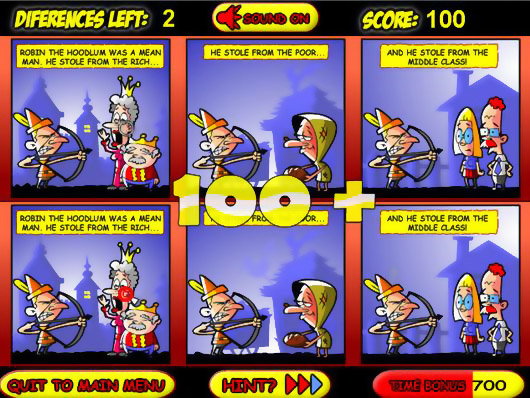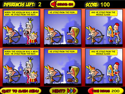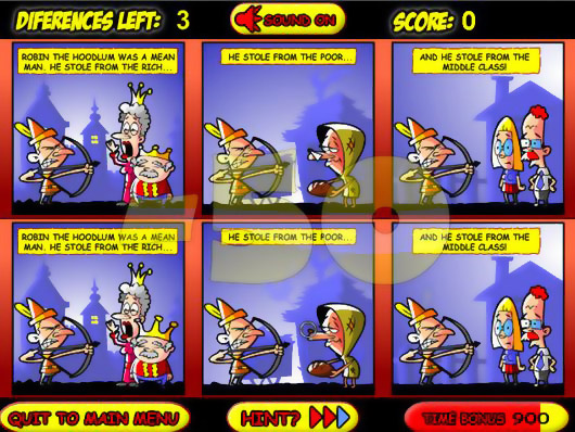 Ищите различия на картинках, продвигаясь в поисках Робином Королевства Моркови и Золота. Пользуйтесь мышью. Кликайте на трех различиях на одной странице. Если найдете различия быстро - получите бонус.
